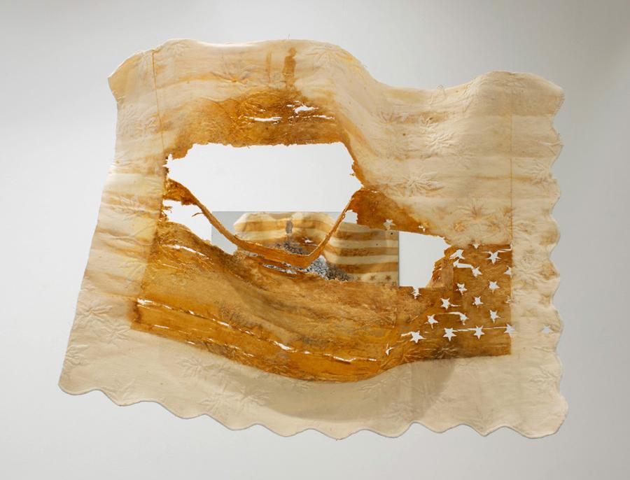 Wall-mounted mixed-media artwork on translucent, irregularly edged fabric, stained