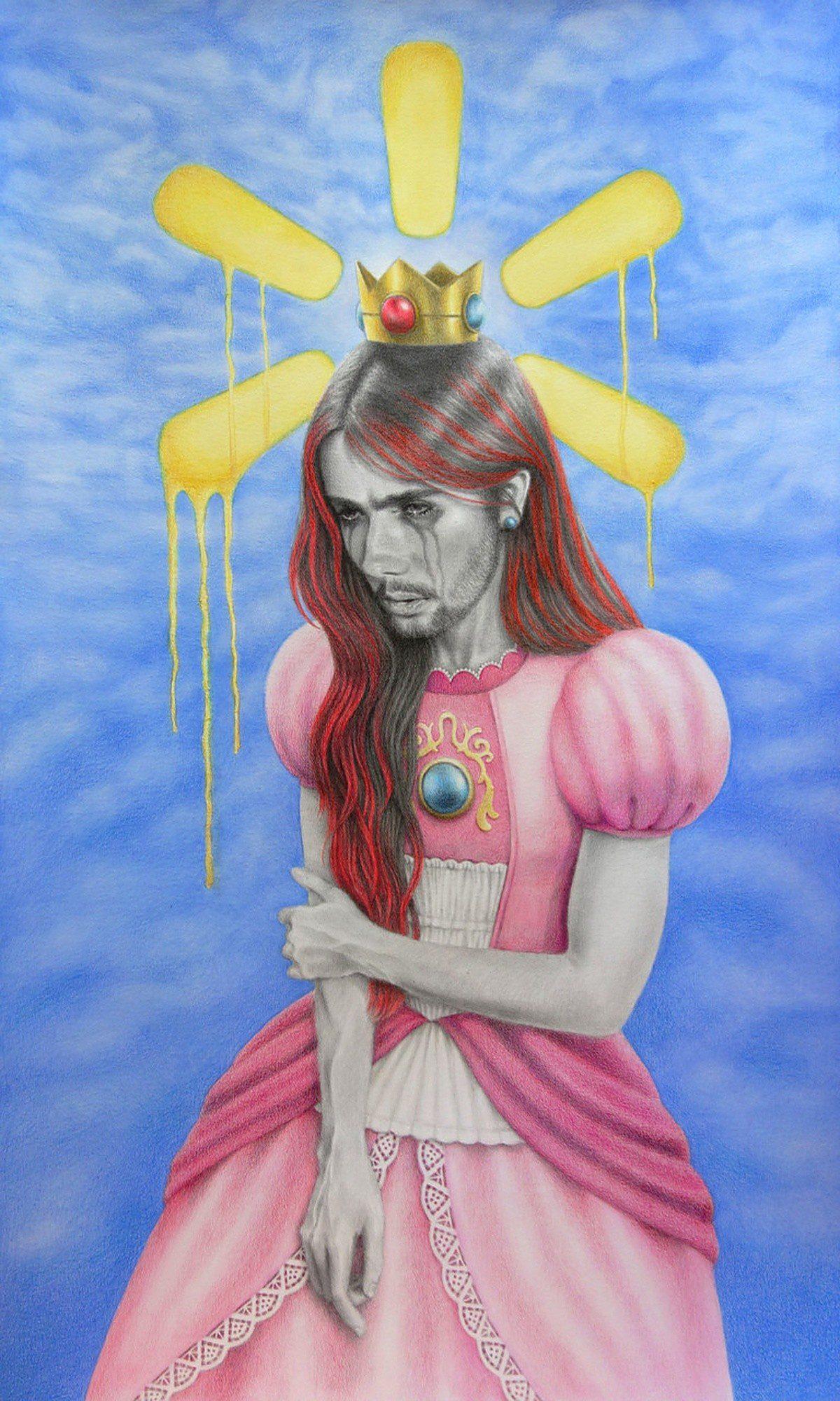 Mixed-media portrait of a person wearing a pink dress and gold crown, with long red