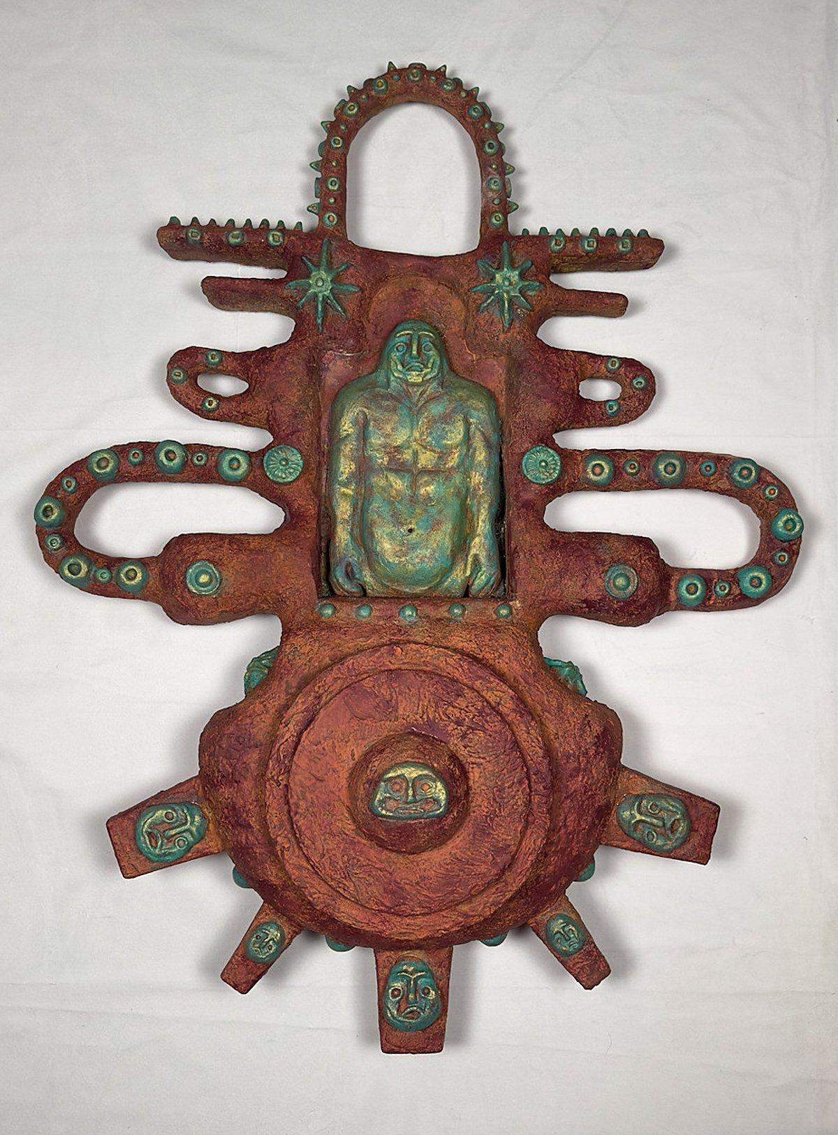 Wall-mounted sculptural form with a central seated figure, radiating extensions and