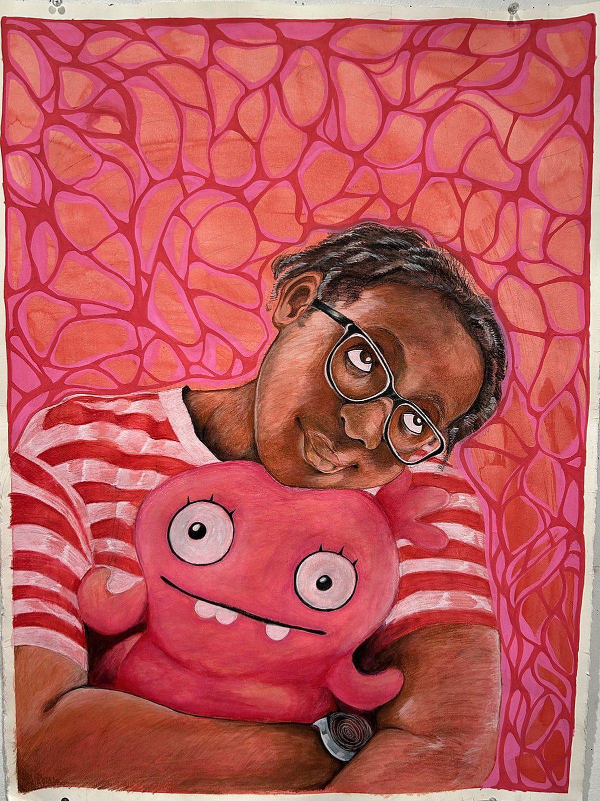 Painted portrait of a young person wearing glasses and a striped shirt, hugging a