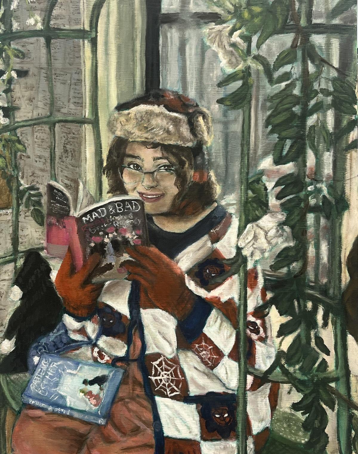 Painted scene of a person wearing a patterned quilted jacket and fur hat, reading